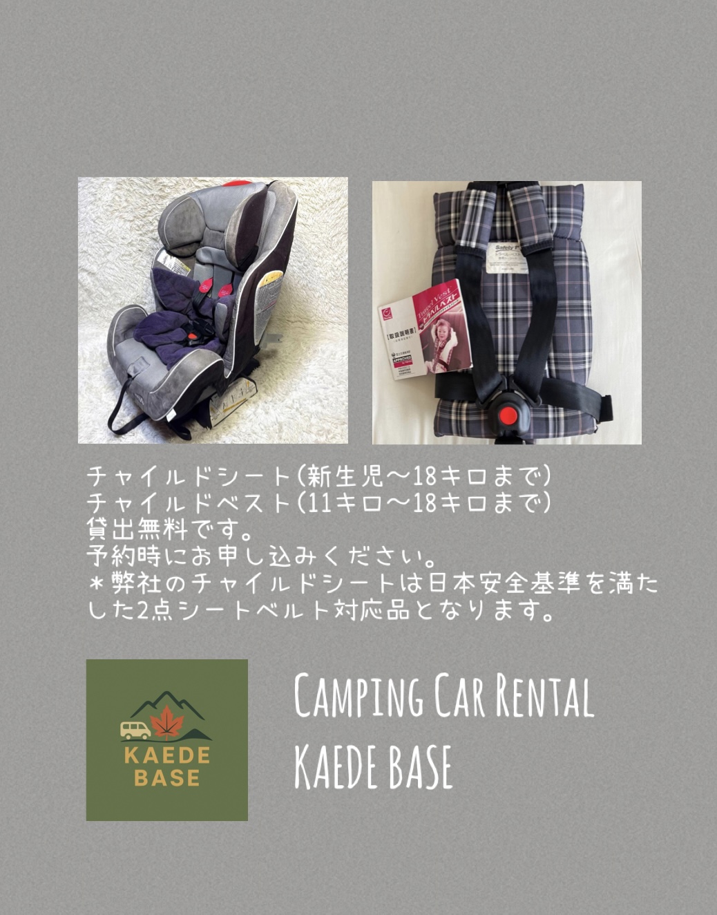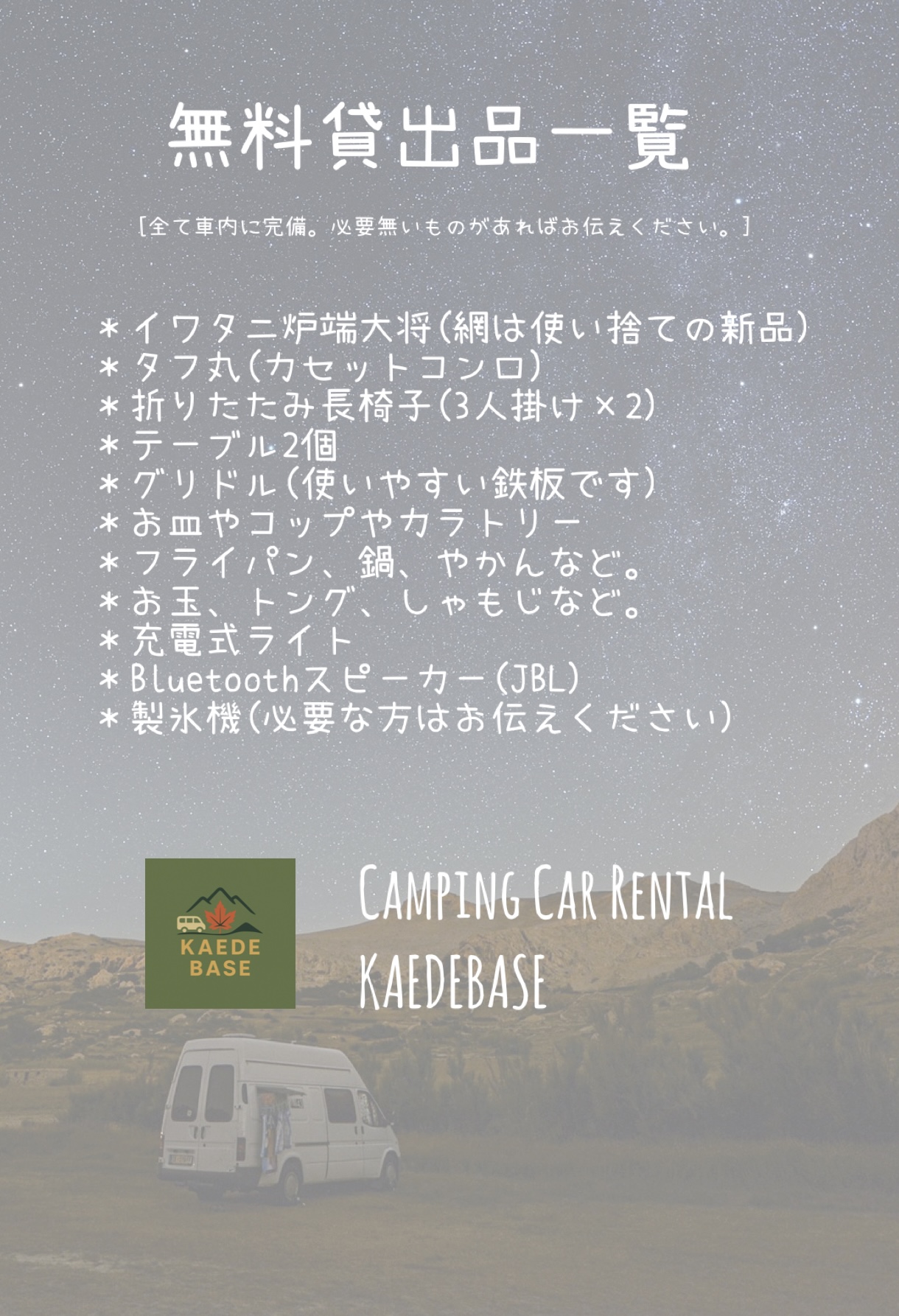 - 6名分の椅子、テーブル、調理器具、チャイルドシートなど貸出無料